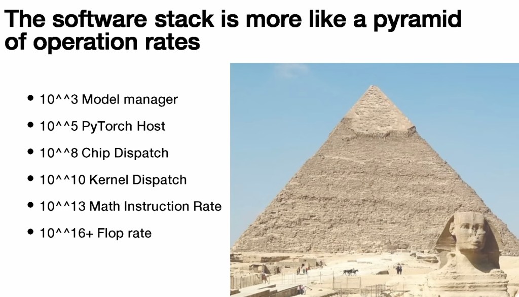 Jim spent quite some time discussing his observation on this universal problem: AI stack is an amazing set of layers, spanning 13+ orders of magnitude. From the highest level of abstraction, to the most fundamental level of computation power, AI computing covers a range that far exceeds the environment in which CPUs and GPUs were developed.
